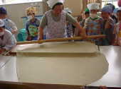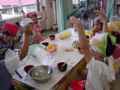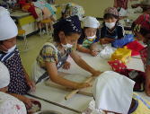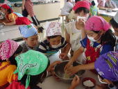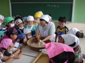 | おそばは、そば粉というものにいろいろな材料をまぜて、よくこねることが大事だそうです。 いつもは300回ぐらいこねるそうです。それからその生地をめんぼうというぼうで、のばして いきます。大野さんのはすごく広くなりました。それからゆでて、水で冷やして食べます。 名人の作ったおそばはすごくおいしかったです。そして名人に教えてもらいながら、私たちは おそば作りにちょうせんしました。こねるところが大変だったけど、どうにかできました。 私たちが作ったおそばは、太かったり、かたかったりしました。さすが名人は上手だなあと 思いました。 |