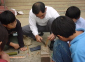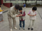 | 中央小10周年記念「文化祭」 三年生は、文化祭のふれあい活動で昔の遊びを しました。ベーゴマ、カンポックリ、お手玉、あやとり、 こま、竹とんぼをしました。この写真は文化祭の何日か 前に、昔の遊び名人から、遊びのやり方を教えて もらっているところです。ぼくたちのグループは初めて ベーゴマをやったので、とても難しかったです。 特に難しかったのはヒモをちゃんと巻くことでした。 名人たちはすごく上手です。 文化祭の様子は「ここ」をクリックしてください。 そのページへ行きます。 |