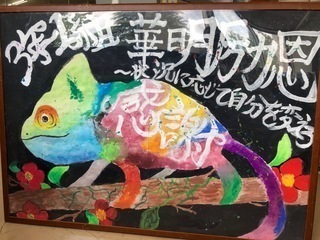 3年生の学級目標にフォーカスします。 サブタイトルに「状況に応じて自分を変えよう」とあります。話し合いが得意な3年生ですが、念のため、担任の清水教諭に確認したところ、生徒の中から出てきた意見とのことでした。 写真のカメレオンは、代表生徒1人が描きました。状況に応じて自分を変化させるカメレオンを象徴的にデザインしました。 子どもの方が、対コロナウイルス「新しい生活様式」に順応しているのかもそれません。